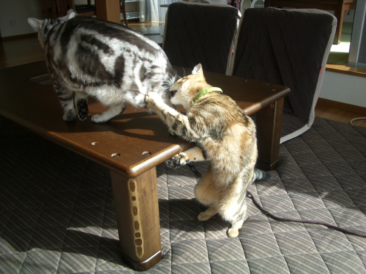 その間、嫁さんが家の中を掃除していたようですが、ハナとグリはその掃除中のこたつ付近でじゃれ合いの真っ最中です