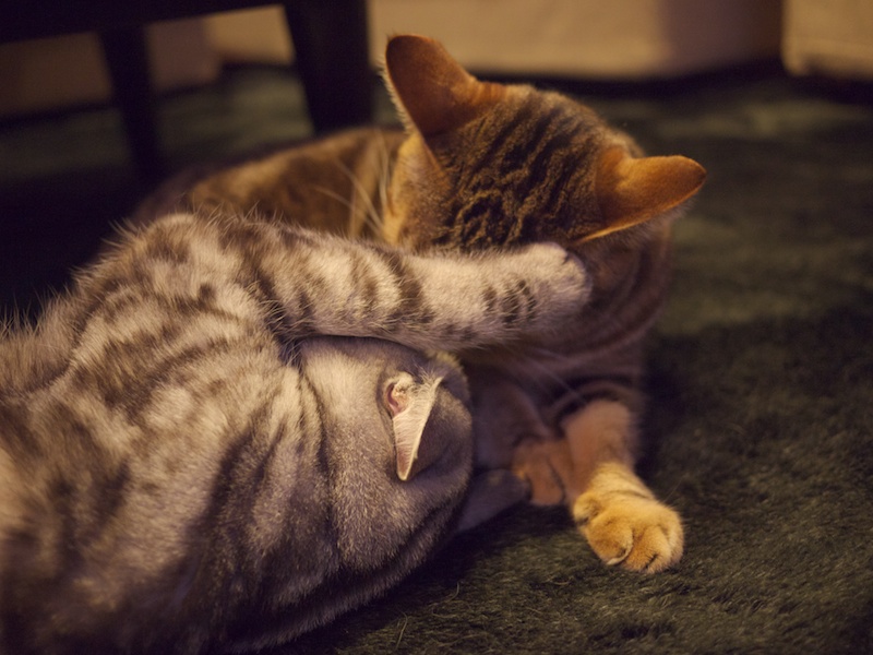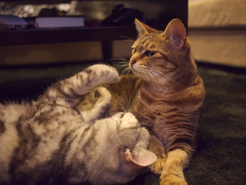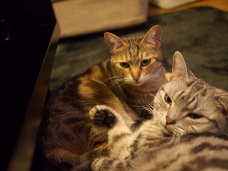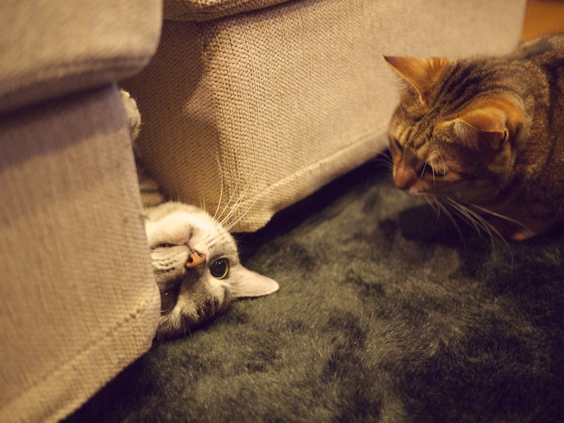 その為、猫たちは隠れる場所がなく、仕方なく机の下で丸くなっています