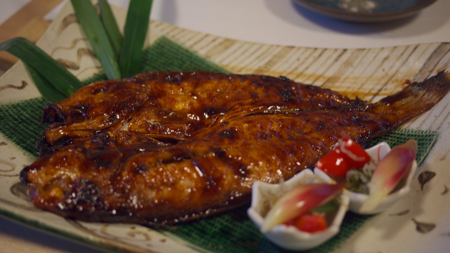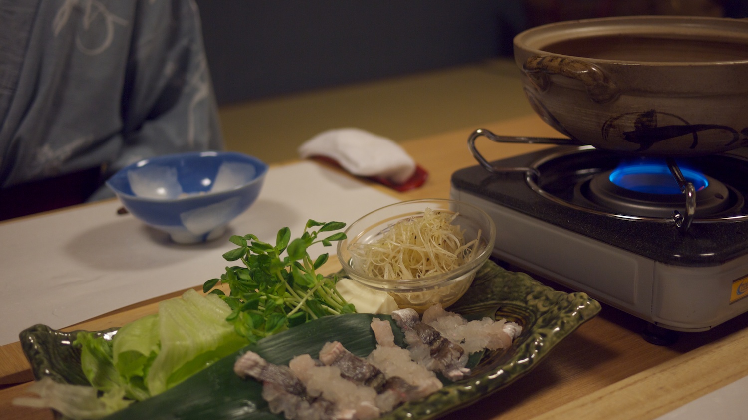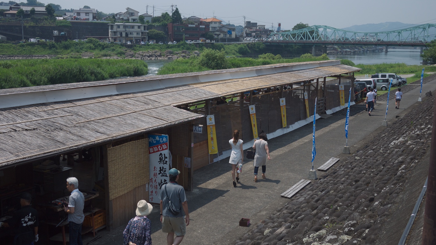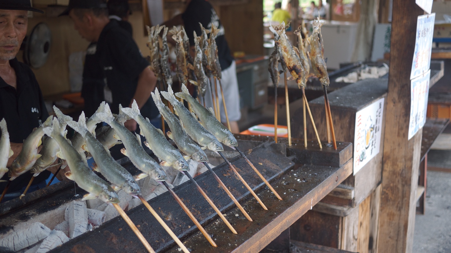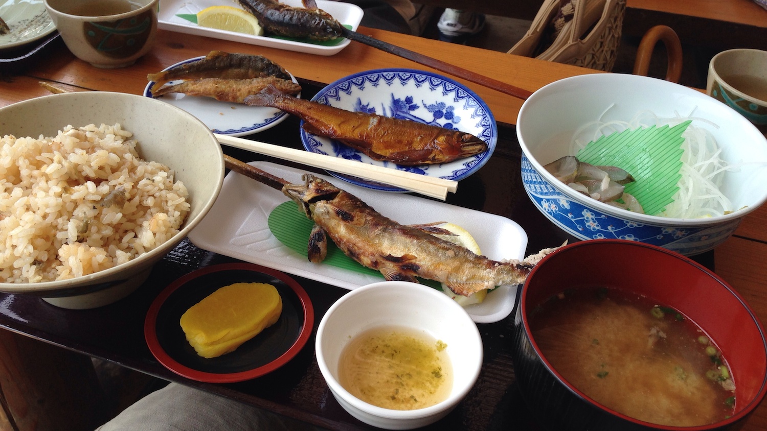 この日の昼食は「鮎料理」。三隈川沿いにある「鮎やな場」