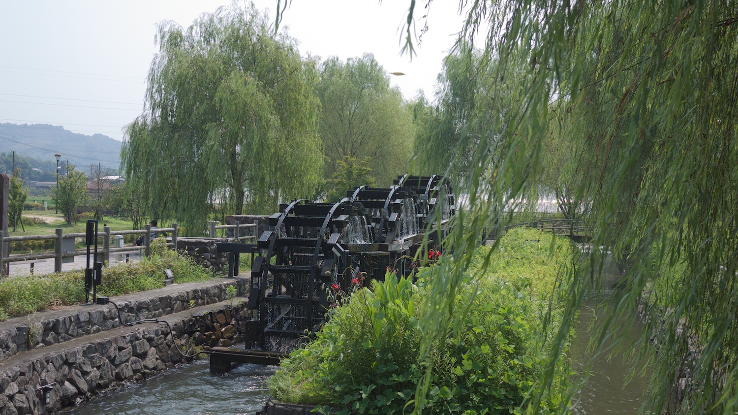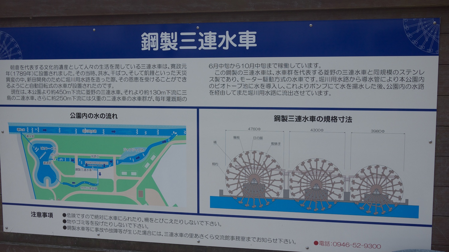 お昼には早かったので、朝倉にある「三連水車」を見に行く